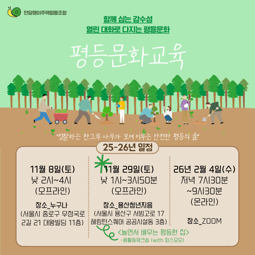 세상에서 가장 편안한 공간, 내가 나로 존재할 수 있는 집이 될 수 있는 한 걸음에 민달팽이 조합원분들의 많은 참여와 토론이 있길 기대합니다.