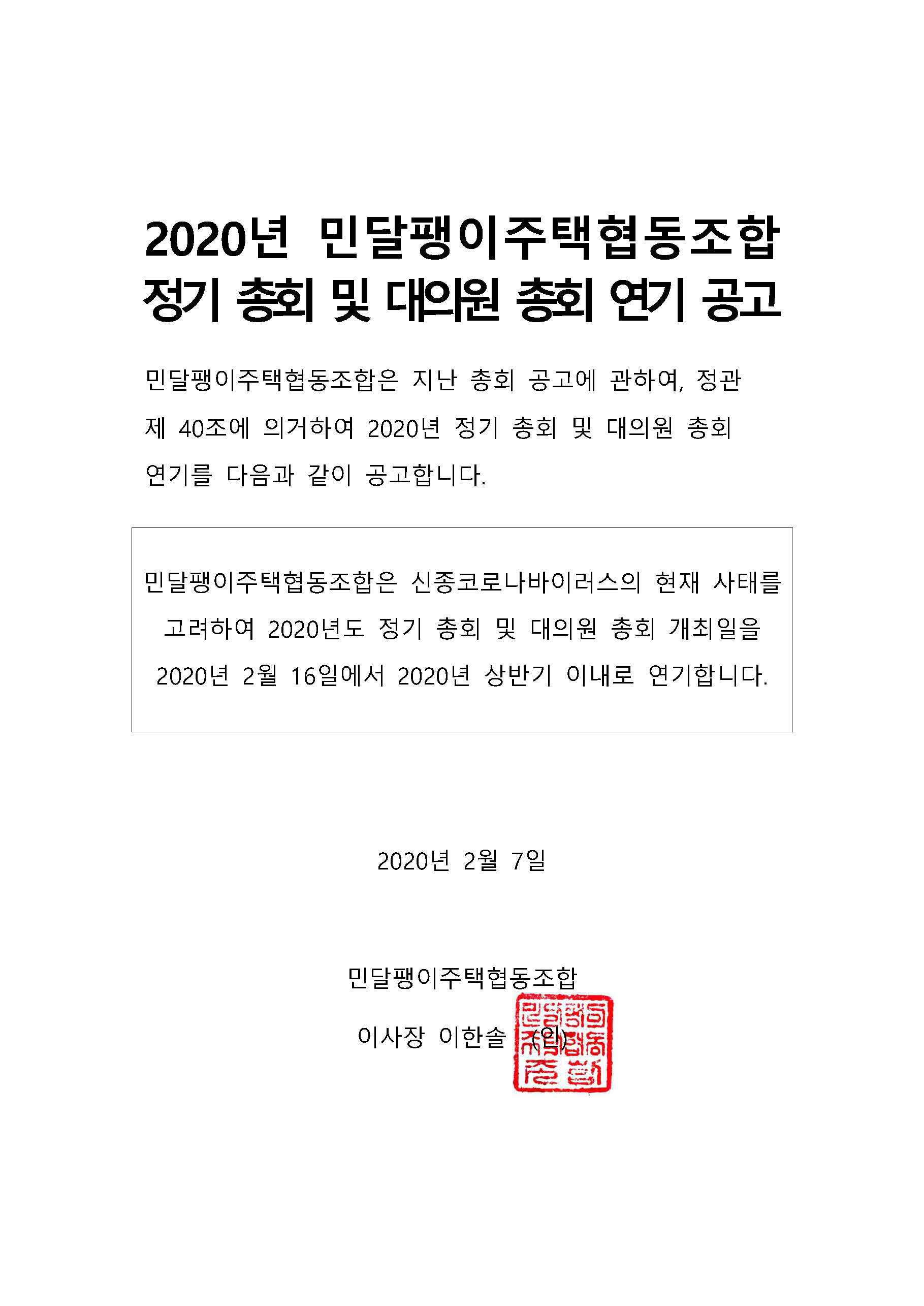 신종코로나바이러스로 인해 총회 연기를 하게 되었습니다.