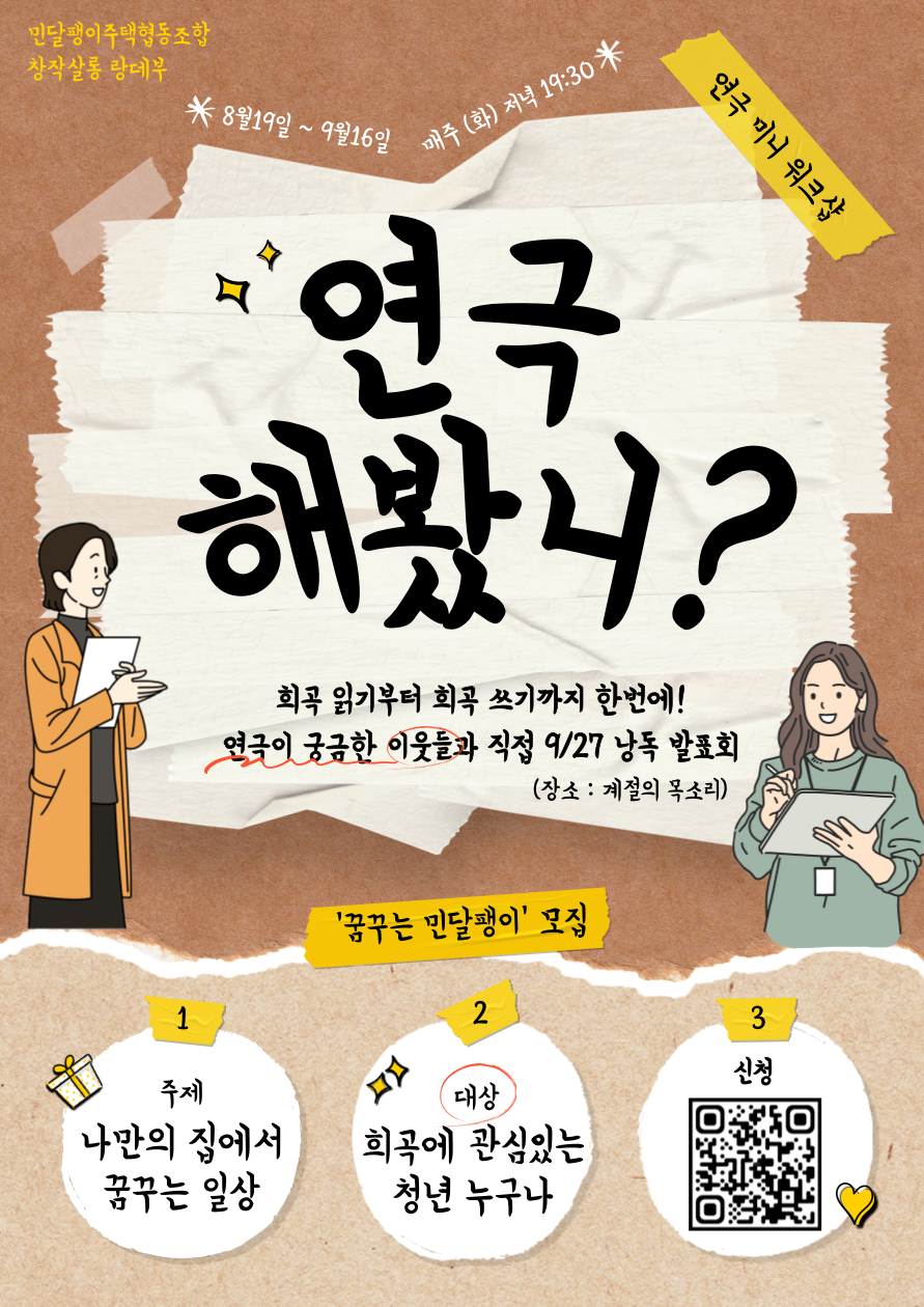 해당 워크숍은 기획자인 극작가 겸 연출가 윤슬, 극작가 겸 배우 성철이 6주간 진행합니다.