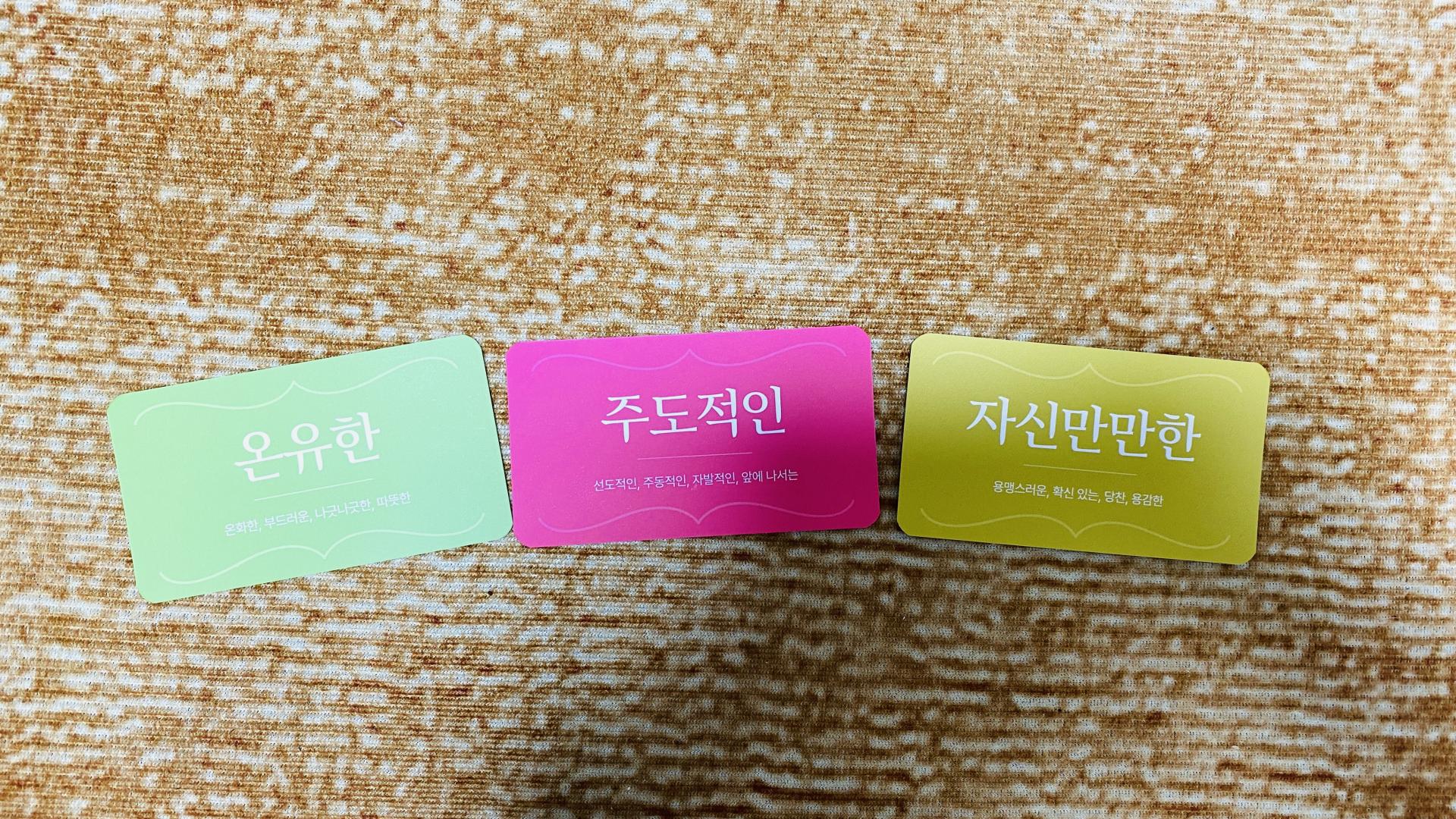 (제 성격카드는 ‘온유한’과 ‘주도적인’이고 가장 저와 거리가 먼 카드는 ‘자신만만한‘이었습니다..!)